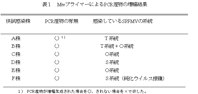 - 千葉県内に発生しているSPFMVには遺伝子レベルで数種の系統がある。独立行政法人九州沖縄農業研究センター病害遺伝子制御研究室がデザインしたMtvプライマーは、供試したSPFMVすべての系統から約1.3kbpのcDNAを増幅できる(表1)。