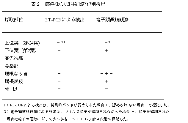 - SPFMVは感染した植物体内で偏在している。検定試料には、比較的ウイルス濃度が高く採取が容易な塊根のなり首部分または展開下位葉を用いる(表2)。