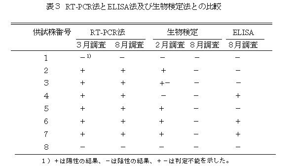 - RT-PCR法は生物検定法やELISA法に比べ高い検出感度が得られ、より精度の高いウイルス検定ができる。また、生物検定法が適用できない高温期でも検出が可能であり、年間を通じてウイルス検定を実施できる(表3)。