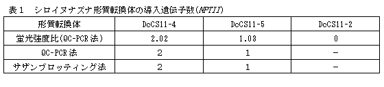 競合的定量PCR(QC-PCR)法に基づく迅速で簡便な形質転換植物の導入遺伝子数および遺伝子型の識別技術の適用により、初期選抜においてコピー数及び次選抜で遺伝子型の判別がわずかなサンプルから可能となり、後代の採種と同時に導入遺伝子の遺伝的固定を終了させることができる。