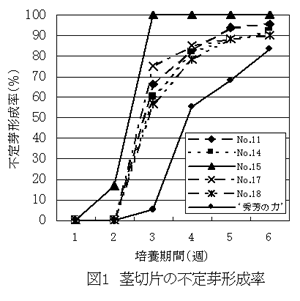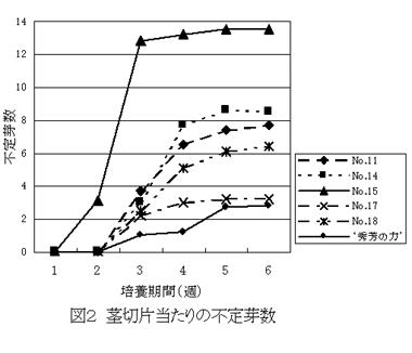 - No.15は不定芽形成が最も早く、不定芽形成率と茎切片当たりの不定芽数も優れる。