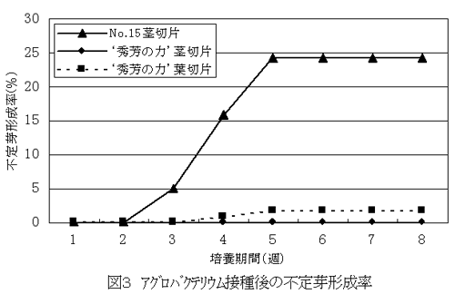 - アグロバクテリウム法によってGUS遺伝子の導入を行うと、No.15は‘秀芳の力’よりも不定芽形成が1週早く、不定芽形成率も‘秀芳の力’を大きく上回る(図3)。