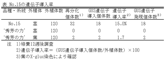 - 培養11週後における遺伝子導入率は、No.15が15.0%、‘秀芳の力’が葉切片で1.7%と明らかにNo.15が優れる(表)。