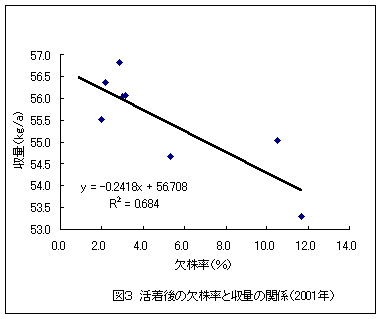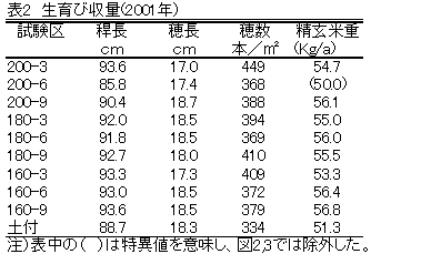 コシヒカリのロングマット水耕苗移植における植付本数は,6~7本/株が多収である。活着後の欠株率と収量の関係は,3%以内が多収となると見られるが10%でも減収率は3.2%にとどまることから,欠株率は10%までは許容範囲にあると考えられる。