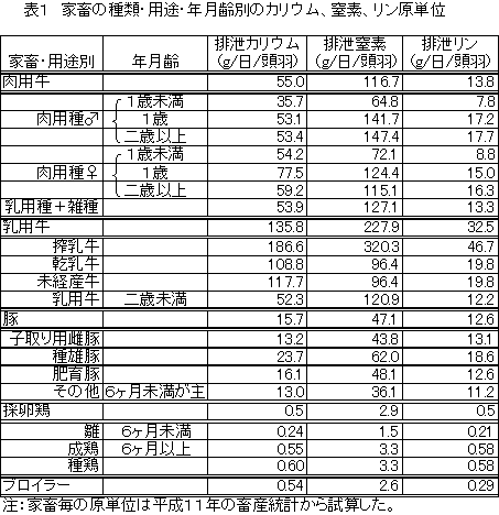 - カリウム原単位は農林水産省統計情報部発行の「畜産統計」に採用されている家畜の種類・用途・年月齢毎に試算する(表1)。家畜毎の原単位は用途・年月齢毎の原単位を平成11年畜産統計記載の飼育頭数で重み付けして計算した平均値である。参考として表1にはカリウムの他に窒素、リンの原単位も示す。