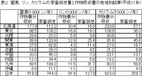 - 原単位の活用例として平成11年における我が国の窒素、リン、カリウムの地域別家畜排泄量試算を行い作物養分吸収量試算値と共に示す(表2)。家畜排泄負荷とこれを受容する作物養分吸収量の比較の目安となる。作物養分吸収量の計算には農林水産省発行の各種統計資料(作物、野菜、果樹)に記載された農作物生産量、作物別養分吸収量原単位、及び表1の家畜排泄原単位を用いている。