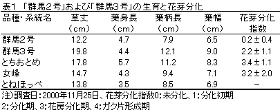 - 両品種とも耐病害虫性は特に付与してないので通常の防除を行う。なお、「群馬3号」は育苗後期にじゃのめ病が発生しやすいので防除を徹底する。