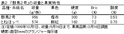 - 果色は橙赤で高温期でも黒ずみ果とならず、中山間地域では7月中旬まで出荷可能である(表2,表3)。