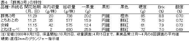 - 果色は橙赤で、高温期でも黒ずみ果とならない(表4)。