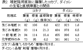 - コカブ、ダイコンなどの根菜類では、堆肥施用直後の播種や施用量が多いと直根障害(岐根)の発生率が高まる(表2)。ただし、10a当たり2t以下で播種の15日前までに施用すれば根の障害は発生しない。