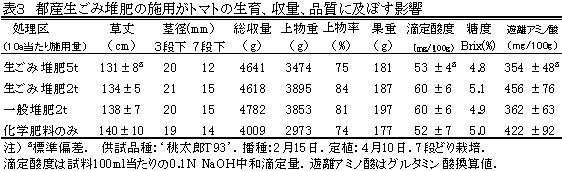 都産生ごみ堆肥は、窒素含有率が3%前後と高いが、施肥量を調節することによって、慣行の家畜糞堆肥と同様に利用できる。施用量は、10a当たり果菜類で2t、葉茎菜類で1~2t、根菜類で1t程度であれば、連用しても慣行栽培と同等以上の生育、収量が得られる。