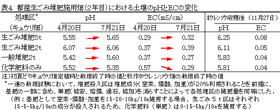 - 生ごみ堆肥を2年間春作と秋作で連用してもECとpHの値は適正な範囲にある(表4)。