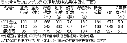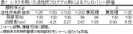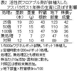 アスパラガスはユリ科の多年生宿根性植物で、長野県では30年以上栽培している農家も見られるが、経済的栽培年限は一般に10年程度である。長野県の栽培面積は1930ha(1999年)で、年間200ha程度が改植時期に当たるが、改植後、新植圃場に比べて減収したり、若年株から欠株が発生するなどの障害が多くみられる。これには、病害虫、植物栄養分の過不足、土壌の物理性・理化学性の悪化などの他にアレロパシーの関与が指摘されている。そこで、活性炭フロアブル剤を利用したアスパラガスのアレロパシー軽減技術を開発する。