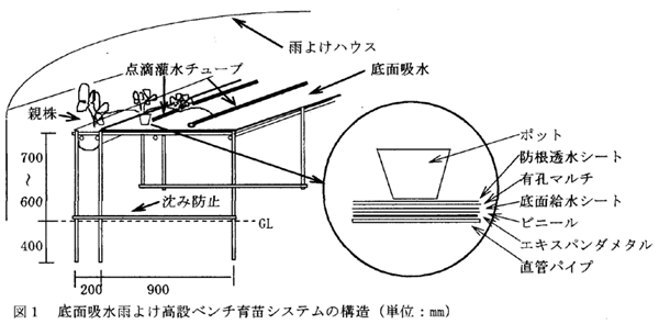 - 本システムはベンチ上に下からビニールシート、底面吸水シート、有孔マルチフィルム、防根透水シートの順に重ね合わせ、この上に7.5cmポリポットを並べてランナーを受ける方式である(図1)。