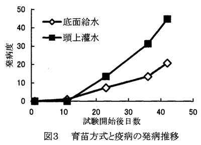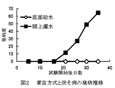 - 炭そ病の発生を抑えることができる(図2)。疫病についても伝搬するが、頭上灌水に比べて発病度を低く抑えることができる(図3)。