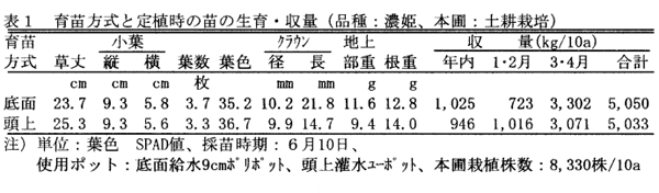 - 苗の生育、花芽分化、収量は、頭上灌水と同等である(表1)。