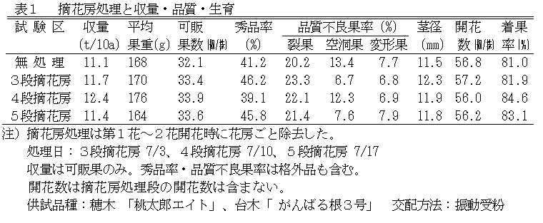 | [キーワード] | 夏秋トマト、摘花房処理、草勢、着果率、労力分散、販売額 |