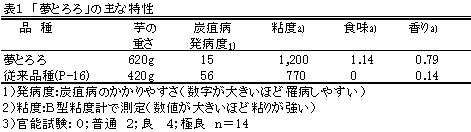 ジネンジョ新品種「夢とろろ」は炭疽病に強く、いもの肥大性に優れ、分岐等の奇形いもの発生が少ない晩生品種である。また,粘りが強く、香り、食味に優れる普及性の高い有望品種である。