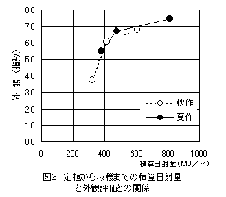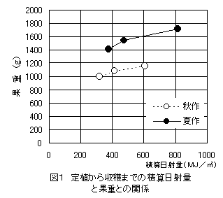 従来のスリークォータ型温室に比較し、建設費が安く大規模化が可能なフェンロー型温室での高品質メロン生産が期待されている。フェンロー型温室は秋から冬にかけての光透過率が低く、スリークォータ型温室よりも光条件が劣る。そこで、高品質生産を行うのに適した温室構造を明らかにするため、積算日射量とメロンの果重・品質の関係を解析する。