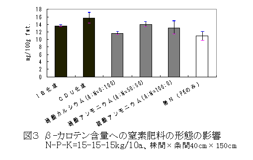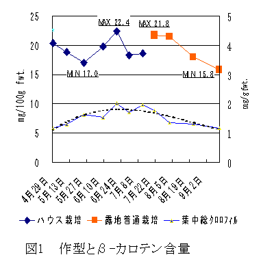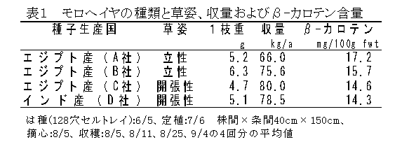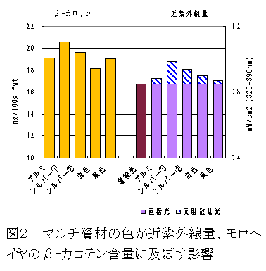 モロヘイヤは、β-カロテンを多く含み、栽培時期によりβ-カロテン含量が変動する。β-カロテンはマルチフィルムの色を黒色からシルバーに換えることにより最大11%、また基肥にCDU化成を施すと増加する。