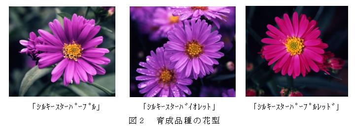 宿根アスターの交雑育種により、花色が明青味紫、一重咲き、9月上中旬咲きの「シルキースターパープル」、花色が明紫、一重咲き、9月中旬咲きの「シルキースターバイオレット」、花色が鮮赤紫、一重咲き、9月中下旬咲きの「シルキースターパープルレッド」を育成した。