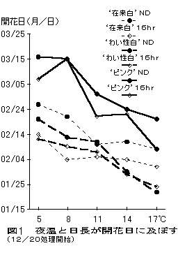 「在来白」は17℃~11℃では開花期に大きな差がないので、出荷時期により11℃以下の夜温で栽培する。「わい性白」、「ピンクファッション」は夜温を高めるほど開花が早まるので、出荷時期により夜温を決定する(図1)。