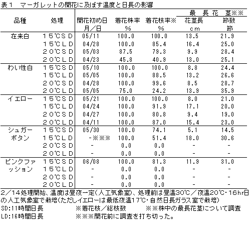 - 生育・開花に及ぼす温度と日長の影響(表1)