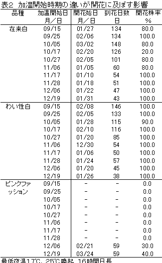花茎の伸長、開花にとって低温遭遇の必要なく、花芽分化が完了すれば加温が可能である。「在来白」は11月中旬、「わい性白」は11月上旬からの加温が適切である。「ピンクファッション」は12月上旬以降の加温で開花するが、開花株率は低い(表2)。