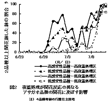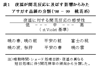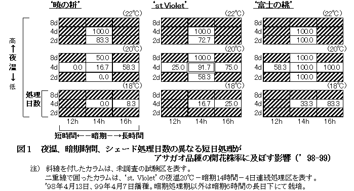 98~99年度に夜温(18、20、22℃)、暗期時間(12、14、16時間)、シェード操作による短日処理日数(2、4、8日間連続)を組み合わせた計9種の短日処理を行い、国内市販営利栽培用アサガオ全43品種について開花株率を調査した。‘st.Violet’は夜温20℃+暗期14時間+4日間処理でほぼ全株が開花したが、市販品種は‘st.Violet’と比較して低夜温でも開花できる‘富士の桃’等の高感受性品種と、高夜温を必要とする‘暁の粧’等の低感受性品種に分類できた(図1、表1)。