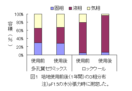 - 多孔質セラミックスは廃鋳物砂を造粒し、800℃以上の高温で焼成したもので、比重0.7~0.8、粒径0.5~1.5mmの灰黒色の物体で、ロックウールに比べて気相率が高く、塩基置換容量もやや高い。pHは6.5と弱酸性を示す。これら理化学性の使用に伴う変化は極めて少ない(図1、表1)。