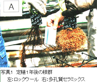 - バラの根は、ロックウールでは培地の底部に長く伸び且つ部分的に褐変しているのに対し、多孔質セラミックスでは、株下にボール状の根群を形成し(写真1)、褐変も少ない。