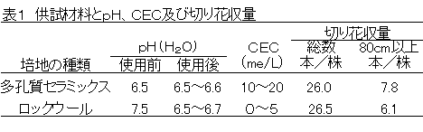 - 多孔質セラミックス培地は、ロックウールと比較して、切り花収量は差がなく、80cm以上の切り花割合では優る(表2)。