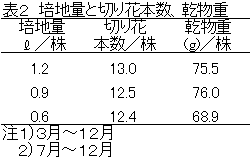 - 株の生産力即ち乾物生産量は培地量が一定レベル以下になると低下する。そのため、深さ9cm、幅21cmのベンチに株間12cm、条間15cmで植え付けると1株当たり0.9lの培地を必要とする(表2)。