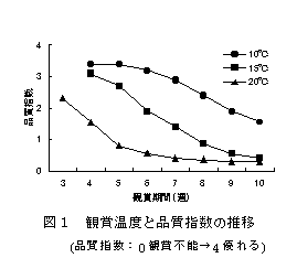 - このように、観賞温度が高いほど葉や花の傷みが早く進んで品質低下が早まる(図1、図2)。従って10℃~20℃の範囲では、観賞時温度を低めに管理することによって品質保持期間を長くできる。
