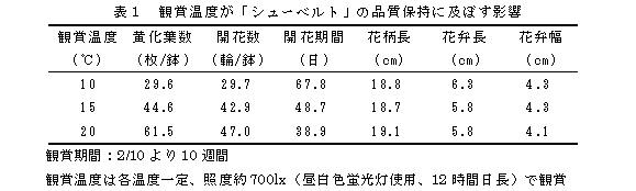 以上から、シクラメンの品質を保持するには10℃程度の低温で観賞すること、明るい場所で観賞することが有効である。