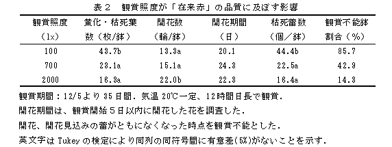 - 開花数は2000lxで多くなり(表2)、低照度ほど開花数の減少が早く(データ省略)、品質低下も早い。