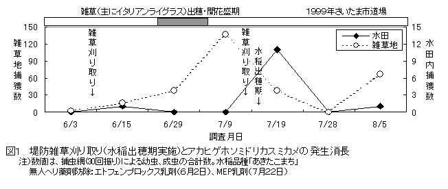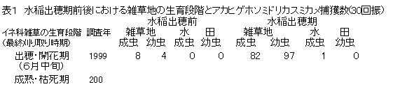 - 水稲出穂期前にイネ科雑草が成熟し枯死すると、雑草地で多発するとともに水田内捕獲数は著しく増加する(表1)。