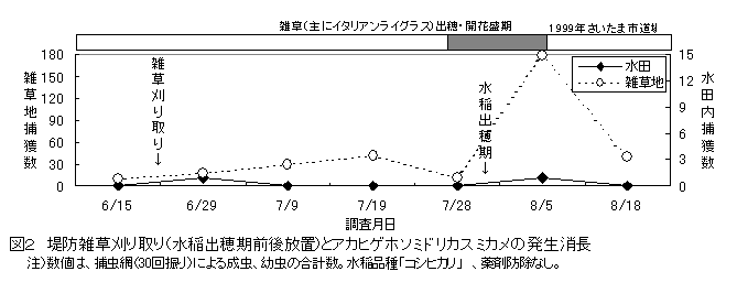 - 堤防のイネ科雑草が出穂・開花盛期を迎えている地点では、水稲出穂期前後に雑草地の刈り取りを行わないと、水田内の捕獲数は増加しない(図2)。