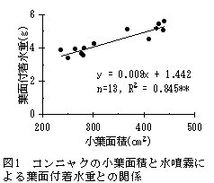 - 葉面に噴霧器で水を十分量流れ落ち始めるまで均一に噴霧し、小葉柄を軽く扇状に左右10回振った後に、葉上に残存した水を葉面付着水とする。このとき、小葉面積と葉面付着水重との間に正の相関関係があり、測定対象の小葉柄の大きさや傾きにとらわれず、採取した葉面付着水を対象に、非破壊且つ実用的な範囲で銅の濃度比較ができる(図1)。