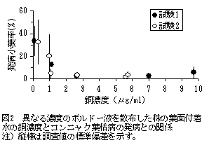 - 濃度の異なるボルドー液を散布した株における、調製した葉面付着水の銅濃度と発病との関係で、1μg/ml以上の銅濃度は、発病を安定して抑制する(図2)。また、葉枯病菌の生育を安定して抑制する葉面付着水における銅濃度は0.88μg/ml以上である(表1)。これらから、葉面付着水における発病抑制銅濃度境界値を1μg/mlとする。葉面付着水の採取は、付着水を調製後、1時間以上小葉をビニール袋で覆い放置し、その後小葉をやや強く振って、葉面付着水をビニール袋内に集める。