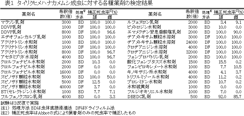 - 虫体直接浸漬法で検定を行う場合には、ナイロンゴース端を下側にし供試虫を集めた後、展着剤を添加した蒸留水で所定濃度に希釈した供試薬剤にピペットごと2cmほど浸漬する。ゴースについた余分な薬液をふき取り、対極の脱脂綿を蒸留水で湿らせシーリングフィルムで封じた後、ゴース側を上にして25℃、16時間日長の恒温槽に保持し、浸漬24時間後(遅効性の薬剤は72時間後)に生死を調査する。また、ドライフィルム法で検定を行う場合は、ナイロンゴースで覆った後、アセトンで希釈した薬液をピペット内壁に15μリットルほど滴下して、ピペットを斜めにし回転させながら内壁全体に薬剤皮膜を作る。その後ピペット内にヒメハナカメムシを入れ、同様に調査する。なお、調査する際にパスツールピペットはガラス厚が薄いので内部が観察しやすい。タイリクヒメハナカメムシを用いた本法による検定結果を表1に示す。