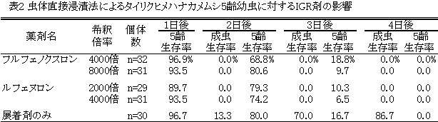 - IGR剤は脱皮時に作用するので幼虫での検定を行う(表2)。
