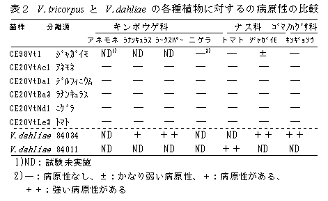 千葉県内で栽培されていたアネモネ、ラナンキュラス、デルフィニウム、ニゲラ、トマトおよび市販のジャガイモから、植物検疫上特定重要病害に指定されていたV.tricorpusが分離された。分離菌の病原性はないか、または非常に弱く、栽培上問題とならない。