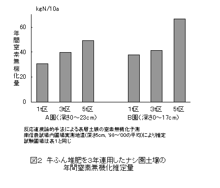 ナシ園へ堆肥を多量に連用すると土壌中の窒素量が高まり過ぎるため、硝酸態窒素の溶脱量が多くなる恐れがある。連用を前提とした牛ふん堆肥施用量は、施肥基準どおりの肥料投入園の場合、全窒素で年間10kg/10a程度を上限とする。