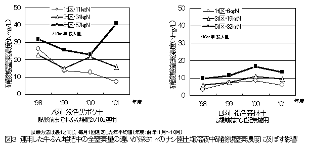 - 連用圃場で土壌深さ1mにおける土壌溶液中の硝酸態窒素濃度は、堆肥施用量が多いほど硝酸態窒素濃度も高く推移した。(図3)