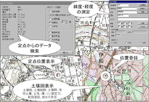 システムでは、任意の地域と縮尺の基本土壌図および応用土壌図を表示でき、さらに土壌図または地形図表示画面上で定点調査の土壌断面や土壌理化学性データ等の検索機能をもつ(図3)。応用土壌図の種類は有効土層の深さ、土性、礫層の有無、リン酸固定力、乾田・湿田区分(水田)、排水の良否(水田)である。さらに、緯度・経度測定による位置登録ができる。