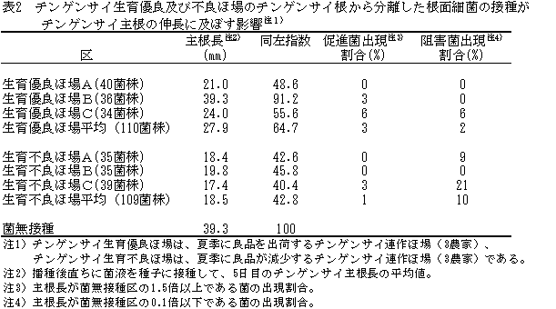 根面細菌をチンゲンサイ種子に接種し、温度28℃、5日間暗所栽培後の主根の長短により、生育促進菌の出現割合が高いほ場と生育阻害菌の出現割合が高いほ場が判別でき、根面細菌による発根促進からみたほ場の土壌微生物特性の評価が可能である。