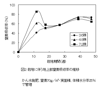 - 同様の隔離ベッドに1平方メートル当たり36株(標準区)、48株、72株を定植し、1作の窒素施肥量を栽培後の残存量が少ない量(およそ70g)として栽培すると、施肥窒素に対する吸収率は、定植後の早い時期には栽植密度が高くなるにつれて高くなるが、栽培中期から作終了時にかけてはいずれの栽植密度も60~70%となる(図1、2)。