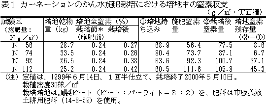 - 以上の結果、栽培後の残留量が少ない施肥量で栽培したカーネーションが1作当たりに吸収する窒素量は、実栽培面積1平方メートル当りおよそ50gと考えられる。