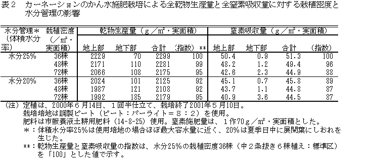- 同様に隔離ベッドで給水量を制限して栽培する場合においても、1作の乾物生産量と窒素吸収量は給水が十分な条件に比較して10%程度の比較的小さな減少にとどまる(表2)。